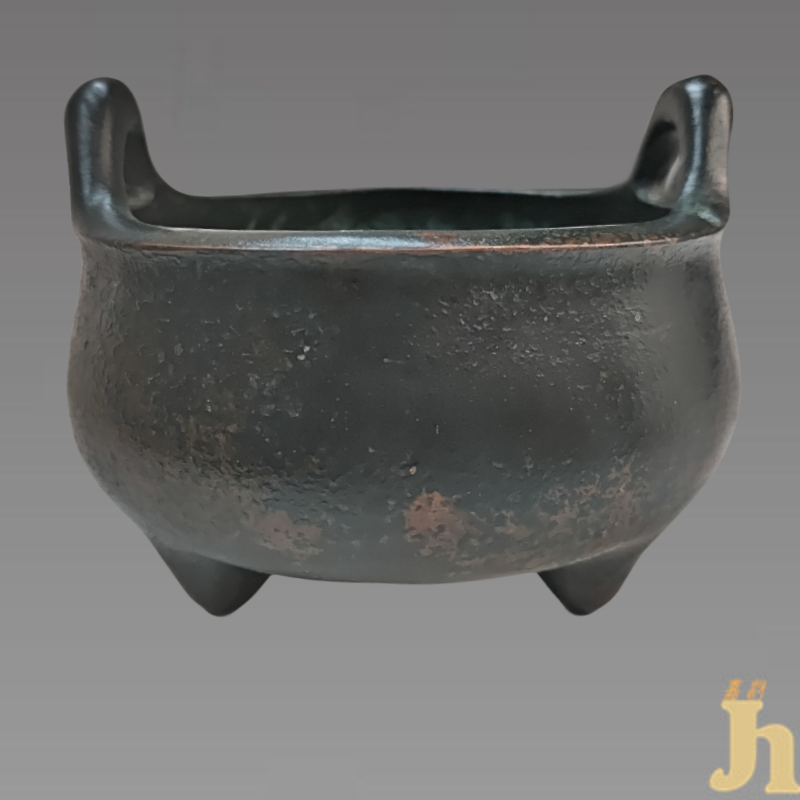 此炉敞口,鼓腹丰腴,两侧系双耳,下承三足,圆熟舒畅。底款落“家藏珍宝”款,框底平整,款字清晰,佳炉佳款。整件藏品线条流畅,工艺精湛,炉身中空,铜质细腻精纯。炉身简洁明快中又不失轻灵之气。整器沉甸,简洁典雅,圆厚端正,线条处理流畅,保存完好,款识清晰。具有较高的收藏价值和文化艺术欣赏价值!