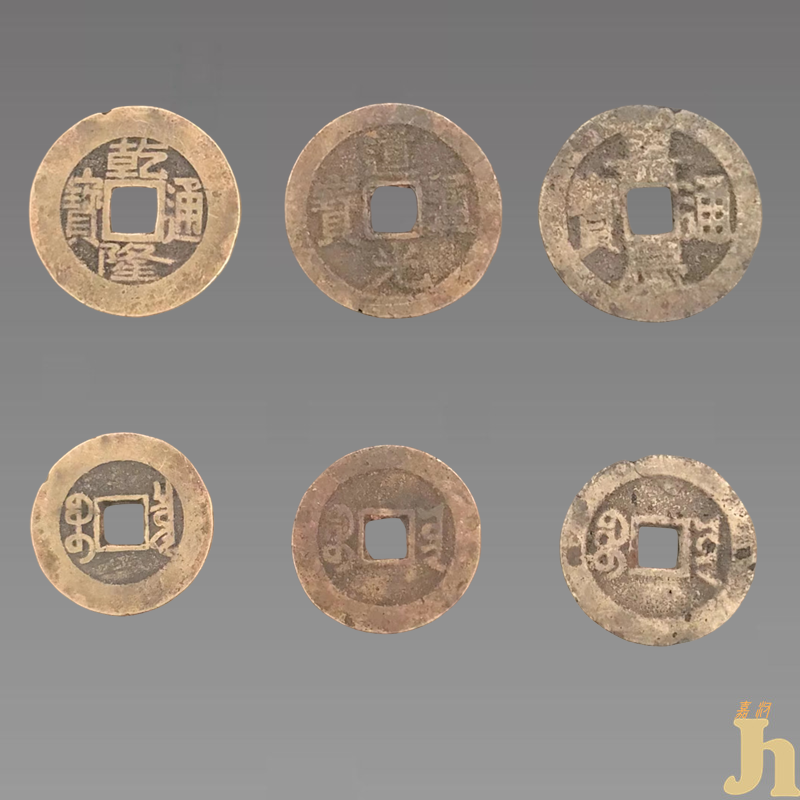 此组三帝钱,一组三件,分别有、乾隆通宝、嘉庆通宝、道光通宝三枚钱币。三枚钱币均采用优质铜材精制而成,铸造精美,形制规整,品相精致,包浆醇厚,锈色古旧,钱文清晰,色泽明亮,成色匀整,古朴素雅,端庄大气,藏品历经无穷岁月的洗礼,仍可保存完整,着实不易,尤其是三枚钱币都保存完好,更是难得,具有较高的收藏价值和文化艺术欣赏价值!