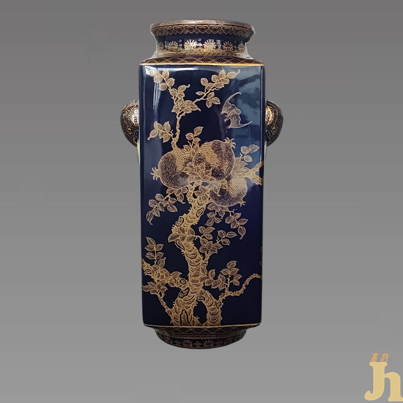 霁蓝描金多子多福四方镶器象耳尊