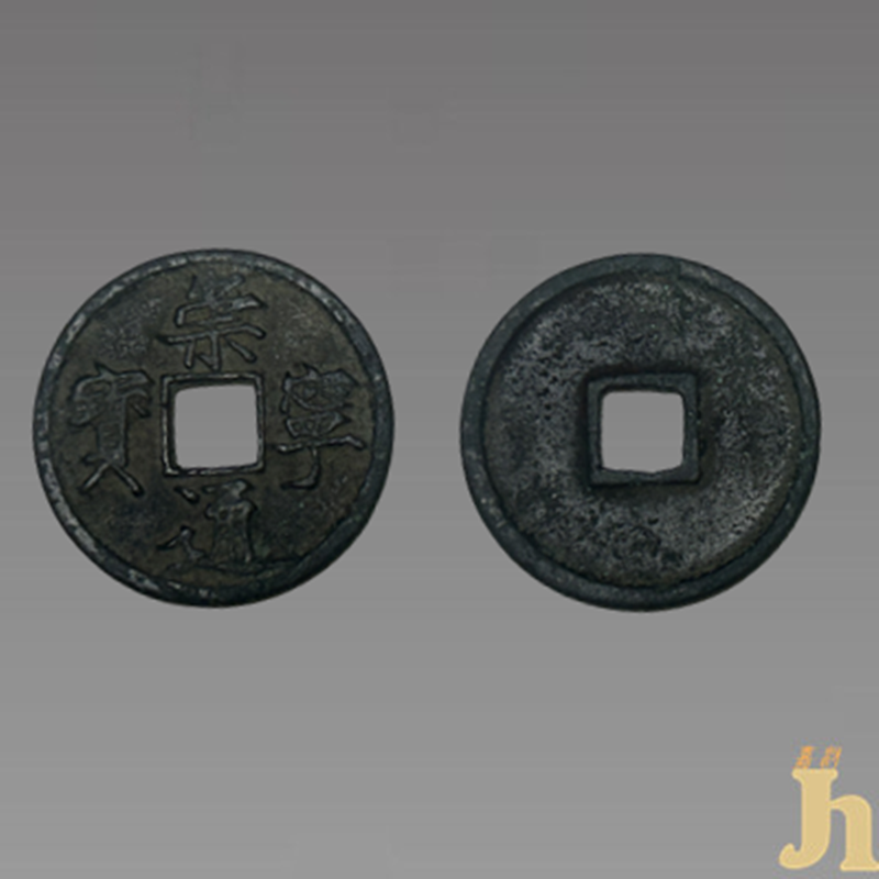 北宋徽宗赵佶崇宁年间(1102-1106年)始铸,年号钱。有崇宁通宝、崇宁重宝和崇宁元宝三种。 崇宁通宝当十型,钱文为徽宗亲书,所以又称其为御书钱。该钱文书法清秀骨瘦,铁划银钩,是徽宗赵佶瘦金书体存留世间的真实显现。宋徽宗更因铸钱精绝,而与王莽并称“钱法二圣”。钱体厚重,青铜质,锈色古旧,开门的老生坑。之所以谓之大字版,是因此品钱文四字饱满,寄廓接缘。