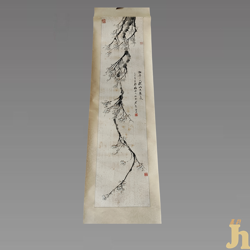 此幅作品画面构图简约,一株腊梅呈S状贯穿上下,树干虬曲粗壮,枝条舒展,白梅点点,花枝搭配巧妙,尽管物象不多,却通过疏密穿插、粗细相间、高低不等地安排营造出“疏影横斜水清浅,暗香浮动月黄昏”之意境,在简约中有一种丰富性。数根梅枝从老干上探出,粗枝用淡墨写,细枝用重墨写,不疏不繁,花朵亦不密集,但有一种倔然向上的生气,一种傲霜挺拔的精神。花朵以淡墨圈出,一笔而成,笔致疏落幽秀,气清而神腴,墨淡而趣足,有超然出尘之致,空里疏香之趣。具有较高的收藏价值和文化艺术欣赏价值!