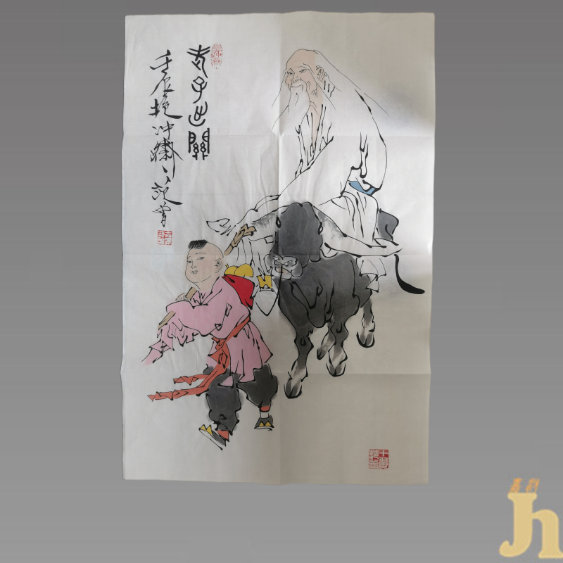在《范曾散文三十三篇》的“紫气东来”一篇着,范先生有这样的画外话:“我喜欢画老子,画他的说法演教,画他的闭目神思,画他的骑牛出关,而旁边总有一个稚拙无邪的村童作他的书仆,背着他的几卷《道德经》和饮水的葫芦。老子则素衣布鞋,须眉皓如积雪,而头发披散,不着巾帻,有飘飘欲仙、不与世争的风神。他微微地欠着腰,半睁半闭着那双洞察天地古今的慧目,寂然凝虑,悄焉动容。在老子面前,我心灵上有一种无法言状的感动,我笔下那霜雪似的毛发,正昭示着皑皑千山般明净高远的学识,那止水般的宁静,也象征着老子澄潭千尺、清澈幽深的思维。”范曾人物画清新典雅,潇洒飘逸,栩栩如生, 呼之欲出,风骨独具。具有较高的收藏价值和文化艺术欣赏价值!