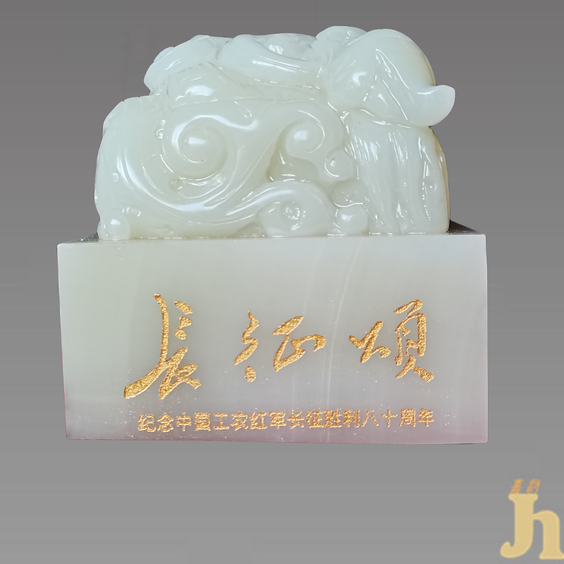 为纪念中国工农红军长征胜利八十周年,铭记中华民族伟大复兴的光辉历程,玉玺采用上等青白玉创作《长征颂领袖宝玺》,纯手工雕刻完成。玺钮以毛泽东龙钮大印为原型,以具有中华民族精神和力量的图腾象征“龙”为元素;玺基正面雕刻:“长征颂”字样;侧面雕刻:“延安”和“苏维埃政府”;背面雕刻:“毛泽东诗词手迹长征”,印文雕刻;“长征路线图”它是中国工农红军长征与和田玉文化的完美结合。具极强的文化艺术性。《长征颂领袖宝玺》其材质珍贵,由中国雕刻大师雕刻传世龙钮,是纪念中国工农红军长征胜利八十周年的文化性和权威性的藏品。具有较高的收藏价值和文化艺术欣赏价值!