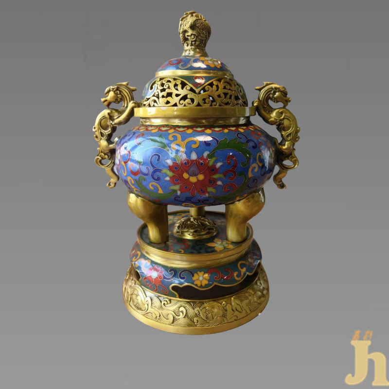 炉分器、盖和底座三部分,铜胎,略侈口,球形腹,腹下渐收,三足鼎立。器底有“乾隆年制”四字两行楷书款。整器造型端庄,做工精致细腻,釉色纯正稳重,色质柔和自然,通体施浅蓝色珐琅釉为地,腹部饰掐丝珐琅各式缠枝花卉为地,纹饰繁复,典雅堂皇,一般古代用来进贡皇帝所用,具有较高的收藏价值和文化艺术欣赏价值!