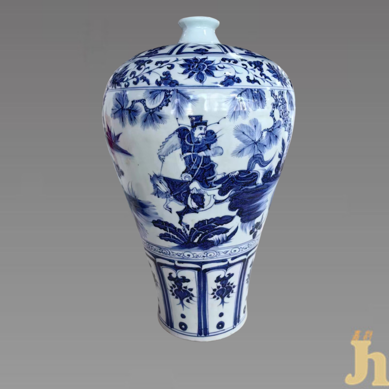 此藏品无盖,小口,口沿平厚,颈短而细,平肩,肩以下收敛,胫部瘦长,近底部外撇,平底;瓶上纹饰精美雅致:瓶口外壁饰杂宝覆莲纹,肩上部饰缠枝西番莲纹,器腹主体饰“萧何月下追韩信”历史故事。腹下部饰一圈卷草纹,再向下饰变体莲瓣纹,变体莲下绘缠丝花卉垂珠纹。韩信乃秦末名将,先投奔项羽,但不受重用,转而投奔刘邦,但只做了个管粮食小官。后巧遇丞相萧何,谈话中萧何发现韩信乃罕见之才,便屡次向刘邦举荐韩信,但均未被采纳。韩信失望无奈决然离开。得知韩信出走,萧何非常焦急,顾不上向刘邦报告便连夜策马率人追赶韩信。众人误以为萧何想去投奔项羽,令刘邦非常生气。后萧何终于追上韩信,且成功把韩信劝回。之后,萧何极力向刘邦举荐韩信,并郑重声言欲夺取天下,非韩信不可。在萧何力谏劝说下,刘邦终于采纳了萧何的建议封韩信为大将。后韩信果不负众望,屡救刘邦于危难,为刘邦夺得天下立下不朽之功,后被封为淮阴侯。辅助纹饰有杂宝、缠枝番莲和莲瓣纹等,画面之外配有五组纹饰带,整个梅瓶装饰繁缛,纹饰带布局疏密有致。具有较高的收藏价值和文化艺术欣赏价值!