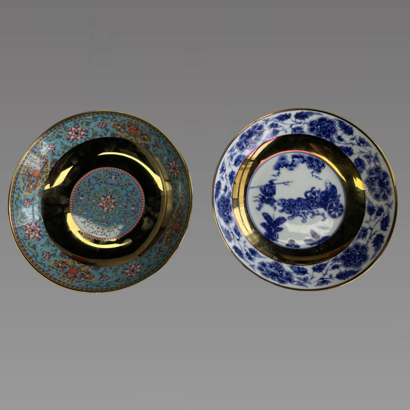 此组瓷器粉彩缠枝花卉纹寓意吉祥美好;器型端庄优美,瓷质细腻,釉色清新怡人。此盘曲线隽美,比例协调。通体盘内施花卉纹,造型严谨,意趣鲜活,运笔俊逸而婉转,层次丰富,包浆润泽,精品,青花鎏金赏盘盘心圈内绘人物纹,所绘情景生动,层次清晰,角色描绘栩栩如生。并装饰有风景、山石、花草、瑞兽等组成的风景纹。具有较高的收藏价值和文化艺术欣赏价值!
