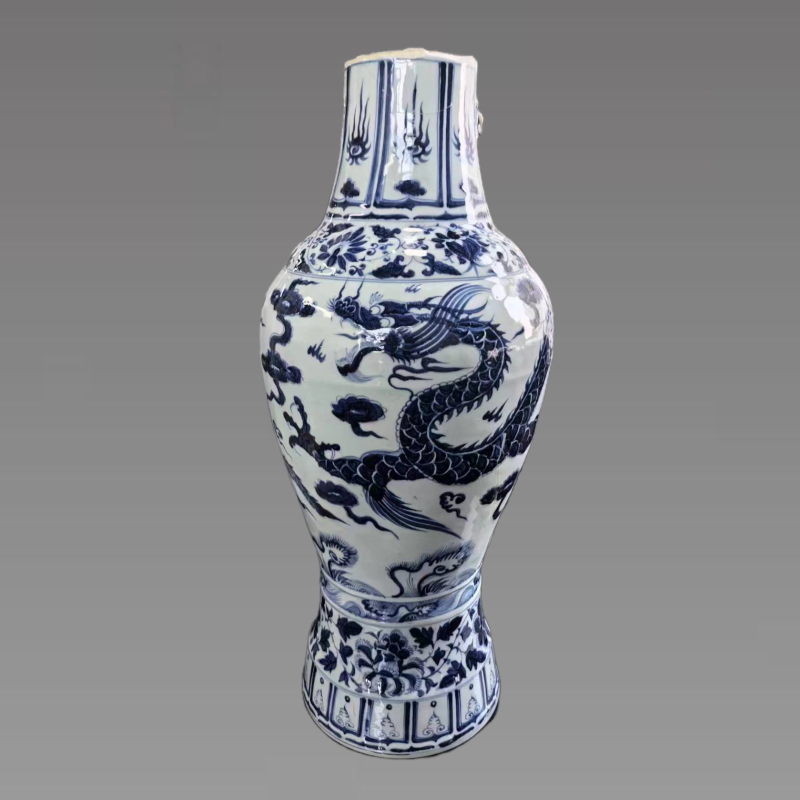 此瓶体大端正,圆口,直颈,溜肩,圆腹,腹下渐收,圈足略高,口与颈大小相若,俗称“赏瓶”。近底处绘缠枝花卉纹,口沿和足边各饰线纹2道,整个腹部绘云龙纹,龙体较大,张口怒目,鬃发上冲,作回首状,四肢前伸,四爪矫健有力。龙身间隙处饰各种形状的云纹,衬托出巨龙行空之势。具有较高的收藏价值和文化艺术欣赏价值!