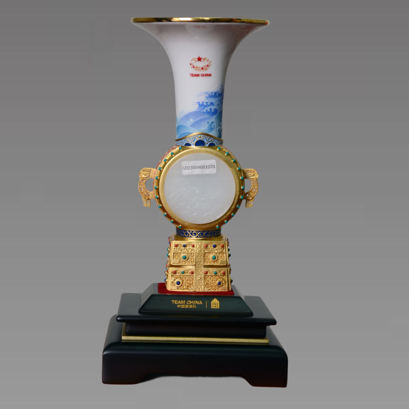 《勇立潮头·中国尊》羊脂白玉版总高20厘米,由陶瓷粉彩、花丝珐琅、玉雕三大传统工艺打造而成,上部陶瓷采用粉彩工共绘制浪潮纹饰,澎湃的浪潮上方竖立着中国国家队标识,中部造型借鉴传统礼器一战鼓,鼓耳由纯银材质打造,前后镶嵌和田羊脂白玉,分别雕刻以故宫博物院馆藏、清代画家袁江绘《观潮图》为原型的钱塘江浪潮图案以及中国国家队桂冠型火花组合标志,底部造型设计以玉踪为原型,四面嵌纯银花丝珐琅片,镶绿松石与青金石做点缀。具有较高的收藏价值和文化艺术欣赏价值!