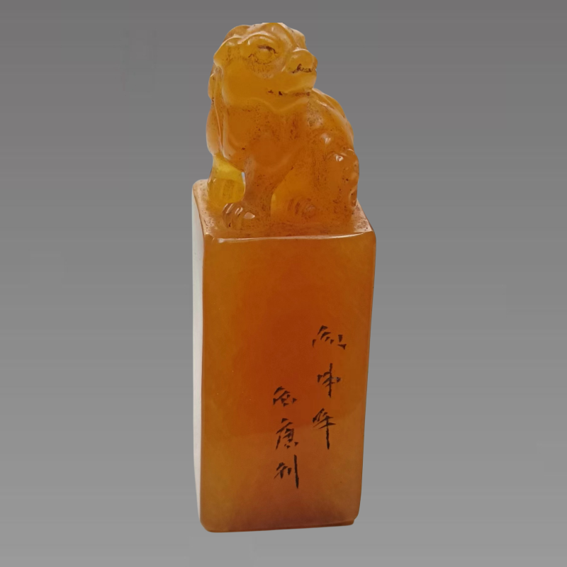 此田黄印章,石质细腻,晶莹剔透,质润透凝腻,萝卜纹清晰密集,颜色滢黄鲜亮,品相完好,包浆莹润,因其质佳色浓,稀少难得,尊为“石中之帝”。此印田黄材质黄中泛赤,温润晶莹,属田黄石中上品。钮部所刻梼杌瑞兽造型生动,线条雕刻有力,兽身开丝细微精致,底部章款的刻制刀工也是一大亮点,整体来看,刀刀见工,刀法犀利流畅,字体的刻制行云流水,没有一处拖沓之感,兽钮雕刻既显形象生动,又庄重威严,富有神韵,堪称当时的顶级雕刻工艺。其珍贵之程度当自不待说。具有较高的收藏价值和文化艺术欣赏价值!