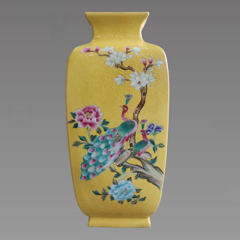 此瓶呈四方形,其胎体厚重,胎质坚密细致,釉面盈润,黄色着地,方口,束颈,溜肩,此所谓“十圆不及一方”,说的就是方器难成。器壁绘蝴蝶纹,且刻画精细,工整中又见巧思,彩料细腻,色彩艳丽,立体感强,瓶身绘两只孔雀站在牡丹枝头,整器用色颇为丰富,设色淡雅,完美诠释珐琅彩之妙!具有较高的收藏价值和文化艺术欣赏价值!