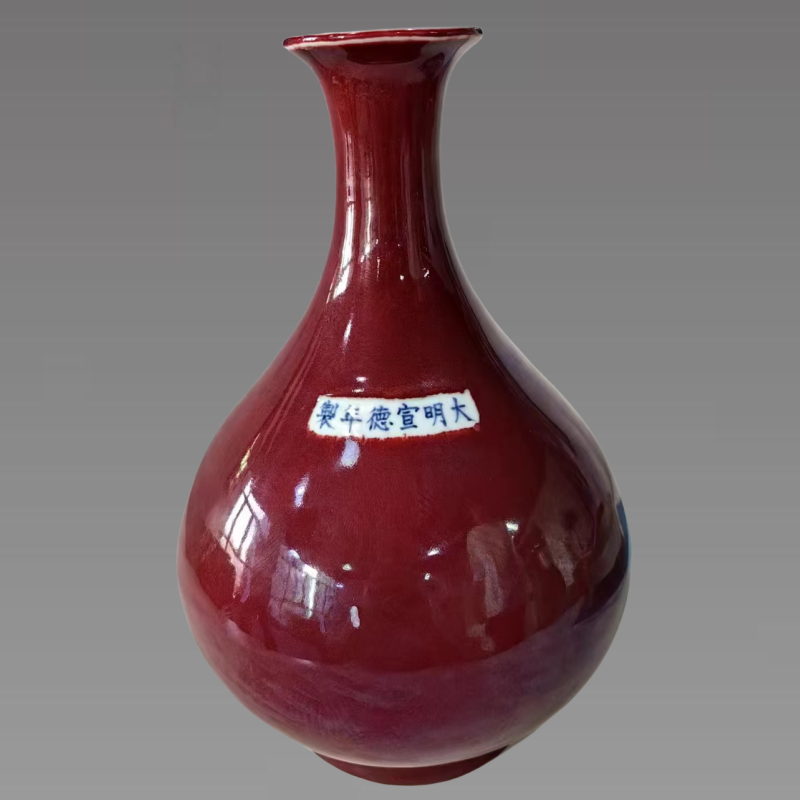 本器撇口,细颈,颈部中央微微收束,溜肩,杏圆状垂腹,曲线变化圆缓,圈足圆滑,以变化的曲线构成柔和匀称的瓶体,线条优美流畅,是典型的玉壶春瓶造型。胎质致密细腻,胎骨坚薄轻盈,造型周正俊秀,足底白釉,并饰青花龙纹,瓶内施白釉,滋润光洁,甜美肥厚,口沿呈灯草白色,外壁满施宝石红釉,肩部楷书【大明宣德年制】款,发色纯净,均匀光滑,鲜红欲滴,似血如霞,娇艳动人更显华美。此件宣德官窑玉壶春瓶,造型极具线条之美,俊逸典雅,圆润饱满,红釉至美臻纯,宛若宝石,瑰丽璀璨,美不胜收,具有较高的收藏价值和文化艺术欣赏价值!