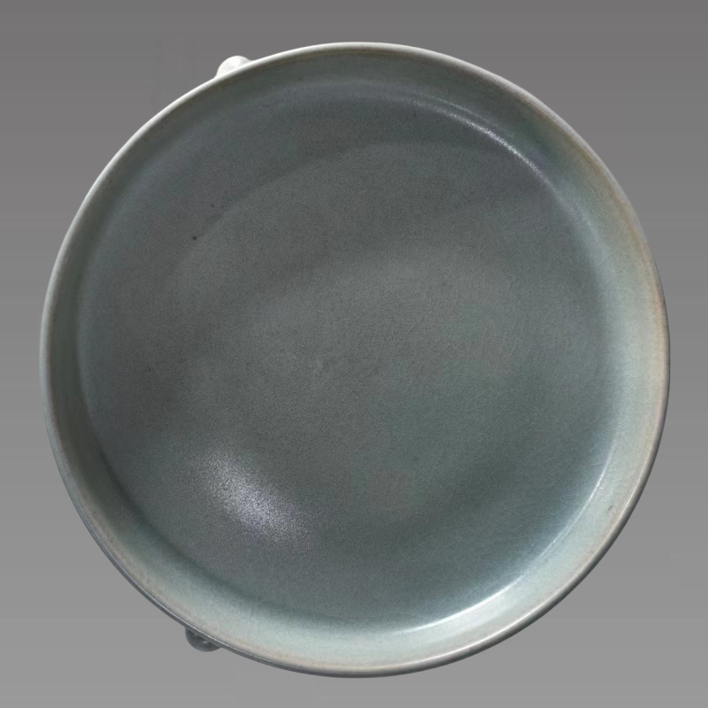 洗直口,平底,下承以三弯足。里外施天青釉,柔和温润。釉面满开细碎纹片。底部满釉,有5个细小支钉痕。此器造型简洁,制作规整,三足显得非常大气,整件器物凹凸有序,具有较高的收藏价值和文化艺术欣赏价值!