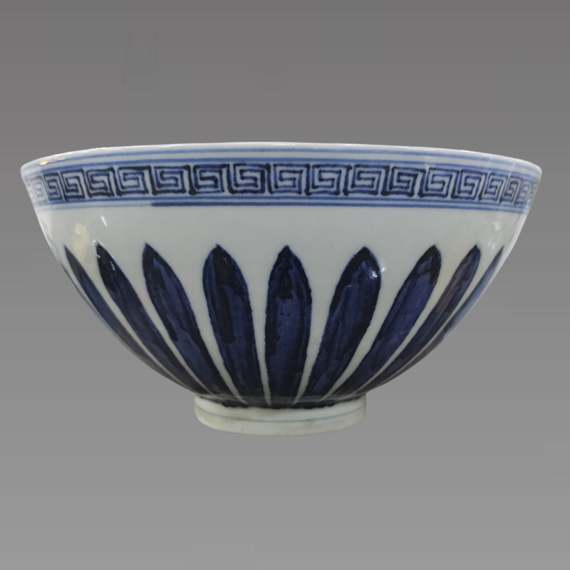 此碗敞口,瘦底,为鸡心碗。底书“大明宣德年制”款青花双圈六字两行楷书款,通体青花纹饰。碗心双圈内饰折枝枇杷纹,内壁饰缠枝花纹,内口饰海水纹。外口饰回纹,外壁饰菊瓣纹,釉面光亮润泽,纹饰线条流畅,纹饰间隔以青花线。圈足内施白釉,此碗外壁以28枚菊花瓣为饰,花瓣细长呈放射状排列。这些花瓣从足上直接伸展到外口沿下,布满整个腹壁,花瓣细长,排列有序。此器青花色调艳丽并有晕散,外壁青花浓艳,色深处呈现铁黑色斑点。纹饰规矩而不失明快。具有较高的收藏价值和文化艺术欣赏价值!