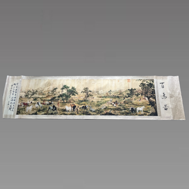 《百马图》描绘了一百匹姿态各异的骏马,放牧游息于草原的场面。马匹有肥壮,有精瘦,或奔驰,或行走,或站立,或蹲坐,或躺卧,或翻滚嬉戏,或交斗觅食,聚散不一,自由舒闲。画卷中郎世宁发挥了西洋画法中常应用的前重后轻、前实后虚、前大后小等写景方法,使画面产生空旷深远的境界,草木、山水、人物无不写实精致。全幅色彩浓丽,构图繁复,形象逼真,郎世宁擅用中国传统绘画技法加入西洋光影透视法及西画颜料,以显示出中西趣味兼容并蓄的画面。如画中马匹、人物、树木、土坡皆应用了光的原理,使物象极富立体感;而如松针、树皮、草叶等的墨线勾勒,石块土坡的皴擦等仍含有中国传统手法,即使是马匹及树干上的阴影表现,亦是以中国传统的渲染方法来完成。画面开始为两棵参天的古松,曲折的枝干、茂密的针 叶、斑驳的树皮。透过松枝的空隙,露出了牧马人搭建的简易白色帐篷,三个身穿满族服装的牧人在帐篷前 ,倦怠地或坐或卧,还有一人双手拄着套马杆立在那里,看着不远处的马匹,一只花斑牧犬从帐篷内伸出了半个身子。近处是一匹浑身滚圆的白马悠然而立,旁边的两匹花马在低头啃草,由此引出了后面千姿百态的群马。在草地上,一群肥瘦不一的马匹各自在觅食、躺卧、翻滚嬉闹。远处群山连绵,草木丛生,一个牧马人正用套杆套一匹跑远的马,另一牧人则在赶拢跑散的八九匹顽皮淘气的小马驹,此处近景也是几棵盘根虬枝的古松,一大群不同花色的骏马或立或卧,或昂首或低头,还有几匹在追逐打闹,好不快活潇洒。具有较高的收藏价值和文化艺术欣赏价值!