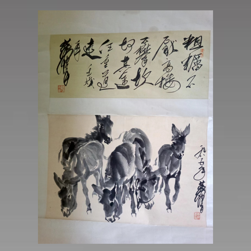 此毛驴作品准确生动地表现他们站立、回头、起卧。每头驴都用淡墨画出用浓墨钩出不同的重点,笔墨表现层次丰富,墨色酣畅淋漓。简洁精炼的块面造型,使毛驴不仅富有情趣,且有相当独特的体积感。画驴群没有强烈的情节性,也没有浓重色彩,而充分利用水墨来表现,大大缩小了回旋余地。每头驴都各具情态,不重复,并利用干湿浓淡,聚散隐显的笔墨变化,使画面更丰富,巧妙地形成了各部分的呼应,显示了画家处理复杂构图的高超技艺。黄胄画驴非常精到,他能够快速、准确地抓住驴的内在精神特质,利用自己的艺术体验和生活的认知度,大胆地将中国传统的笔墨技法与西方素描技法糅合在一起,将毛驴这个人们生活中早已熟知的形象进行了艺术性的夸张,使其别具一番自然意趣。他笔下的驴,外表温顺,骨子里却透着一股倔劲,一股不屈不挠的倔强。他通过毛驴这个艺术形象来颂扬人间的真善美。生活中那些常见的小动物在黄胄的笔下得以延续其鲜活的生命活力,突破了时间、空间的限制,再现了生命伟大的一面。具有较高的收藏价值和文化艺术欣赏价值!