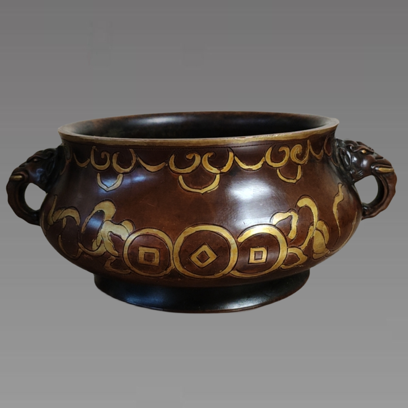 根据《宣德彝器图谱》记载,象耳炉最早见于唐代天宝局所铸造的象首彝炉,再被宋代哥窑制成瓷香炉款式,后又被宣德炉制造部门所借鉴。大象自古以来就是吉兽,性格温顺、任劳任怨,有“太平有象”的说辞。明宣宗在象耳炉制成后,将其赏赐给了工部尚书和侍郎,应当是鼓励其不畏劳苦、负重致远,普贤菩萨骑白象、文殊菩萨骑青狮,都有普度众生、广结佛缘的意思。