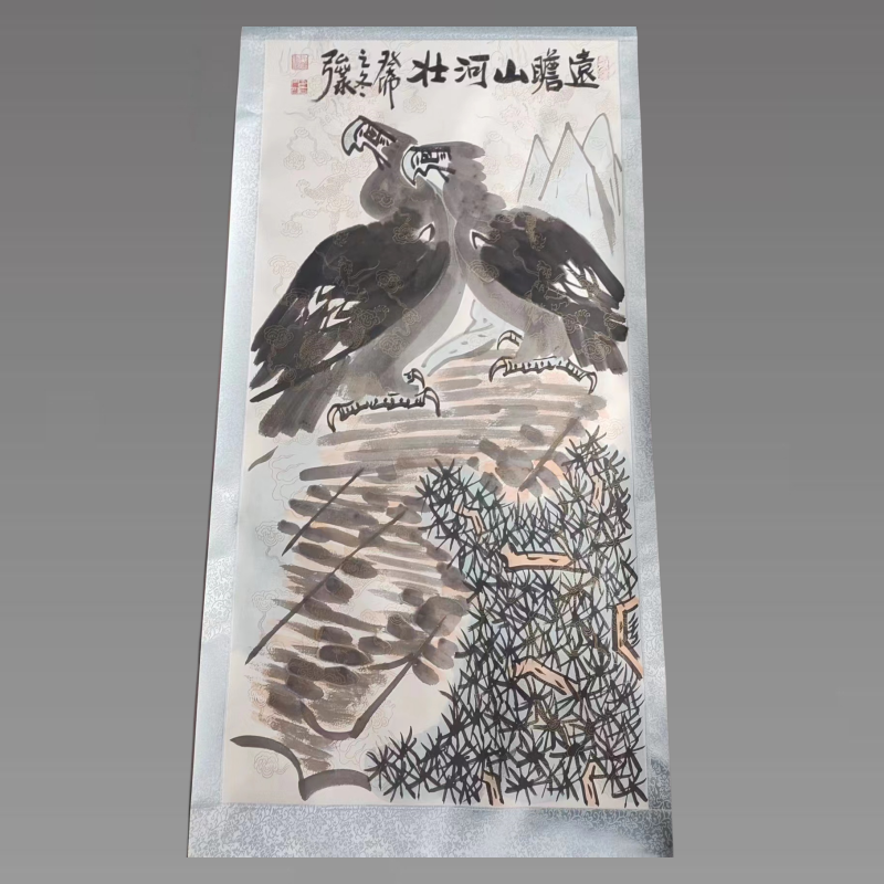 画中的鹰,浑厚苍劲,大气磅礴。近景两只苍鹰雄踞山顶,雄赳赳气昂昂的姿态诠释着强烈的爱国精神以及刚毅的性格。题之“远瞻山河壮”全然是以已身同祖国壮丽山河融为一体的寄托。作者纵横挥洒的浓墨,将大鹏——中华刚毅精神之化身的雄鹰突现于山巅之上,不愧为新时代的中国大写意巨作。具有较高的收藏价值和文化艺术欣赏价值!