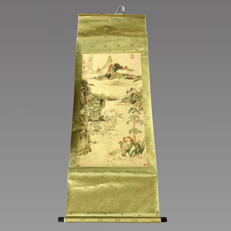 《隔水吟窗图》整幅构图精巧,左右山岗对峙,左岗山隈处绘屋宇院落,四周梧桐高轩,柳竹成荫。画家运用没骨设色法,以石青、石绿、朱红、赭石罩染山峦岩石,以石绿、朱红点叶,以白色勾染云霭,明丽雅洁,是作者晚年青绿山水的精品。图中自题“隔水吟窗若有人,浅蓝衫子墨绫巾。檐前宿雨团新绿,洗却桐阴一斛尘。乾隆己巳春新罗山人写于解弢馆并题”。下钤“秋岳”朱文印,“岩穴之士”白文印。为作者六十八岁时所作。具有较高的收藏价值和文化艺术欣赏价值!