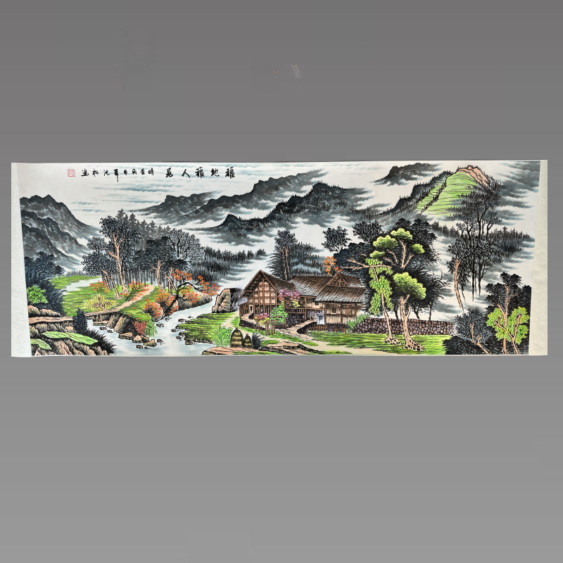 此幅作品绘春天秀丽之景色,山峰成叠,绿树成荫,烟云弥漫,房屋几间,景色奇丽壮观,意境高远,山间云雾弥漫,瀑布流淌,有财源滚滚、福泽万代的含义,山水养人,寓意聚气,水随人秀,山为财聚,自然于人的福气则为此。能将宅基运为福地,苍劲的山脉,坚韧向上,古松和林木清秀,画中,美好运势之意突显,豪迈大气之视涌现,境界高远,引人叹为观止。具有较高的收藏价值和文化艺术欣赏价值!