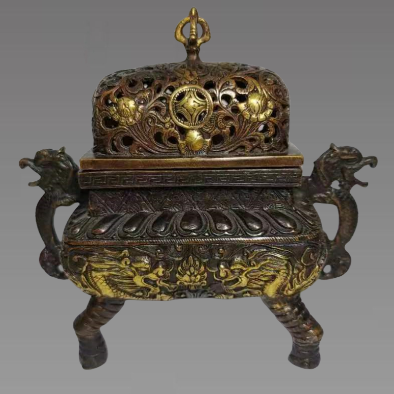 整器简洁规整,精铜铸造,鎏金厚重,成色好,器型规整典雅,两侧鏨刻双龙耳,炉腹饰莲花纹,纹饰精美生动,鎏金状态一流,呈四足双耳,皮壳老辣,内壁干净整洁,具有较高的收藏价值和文化艺术欣赏价值!