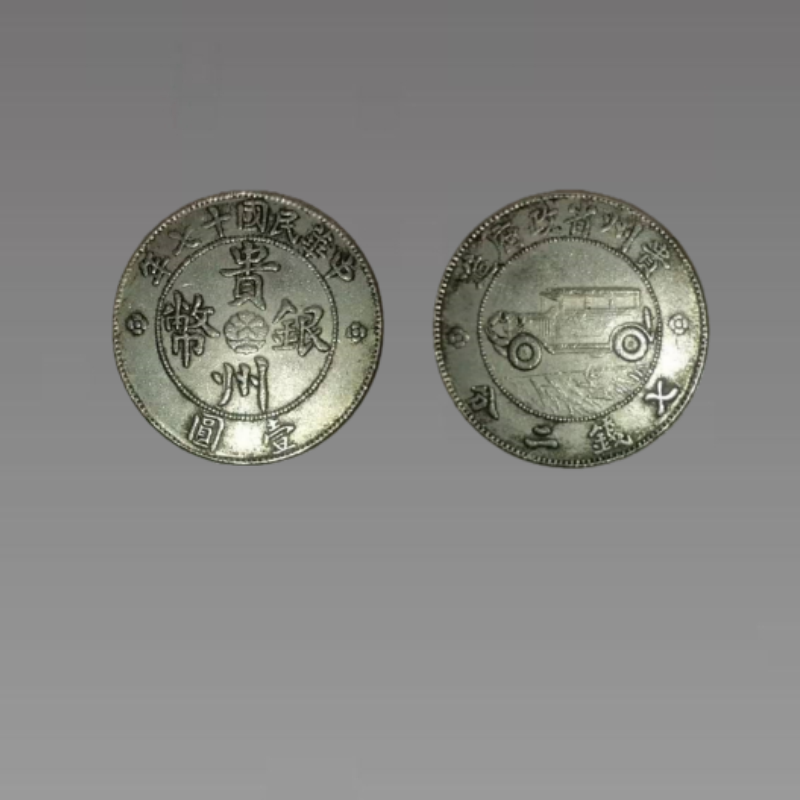 贵州银币,光绪及民国年间制造,其中光绪年间贵州官炉熔铸过五种“黔宝”银币。“黔宝”存世十分稀少,殊珍贵。制造的钱局名称为贵州官局、黎平官炉、贵州官钱局、贵州造币厂。“贵州轿车银币”俗称“轿车银币”、“轿车银元”,简称“车板”,国外称AUTO DOLLAR。该银币以轿车为图画,这在中国钱币史绝无仅有。在中国已知发行的近千种老银币中,“轿车银币”因图画特别,锻造量少,流转面窄,存世稀疏等,早已是币中珍品。
