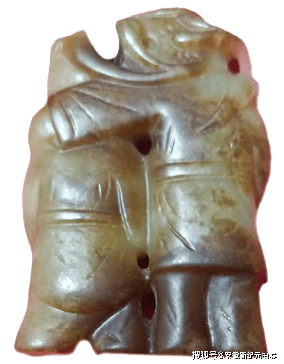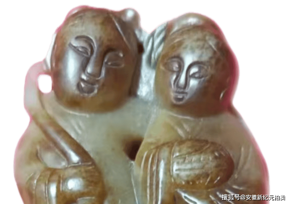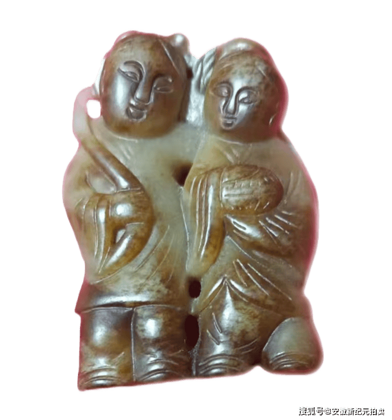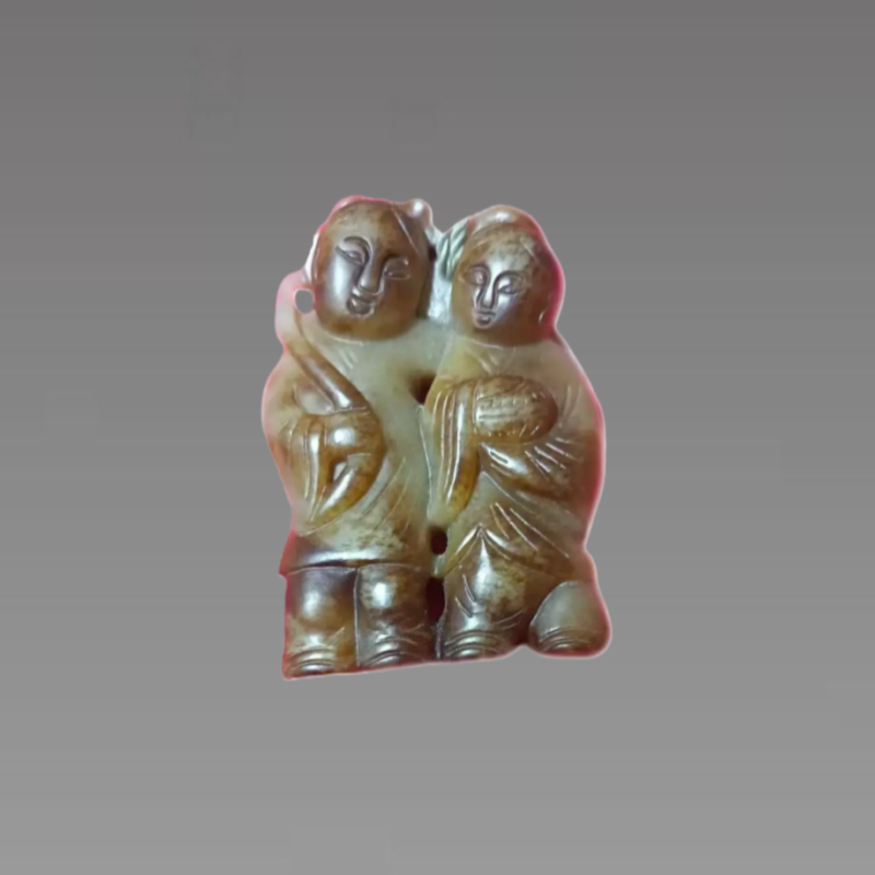 这件玉器采用“双人连体圆雕”的形式,将寒山、拾得设计为并肩相依的孩童形象 —— 头部圆润饱满,面部线条简化却突出笑容的舒展感,符合民间对 “吉祥孩童” 的审美偏好;人物身姿紧凑、肢体略有交错,既强化了 “和合共生” 的亲密感,也让整块玉料的利用率更高,是传统玉雕 “因材施艺” 的体现。人物之间的空隙则用透雕处理,既避免了玉料的厚重臃肿,也让双人形象既有连接又不局促,同时透雕的孔洞也方便穿绳佩戴,兼顾了装饰性与实用性;而面部的眉眼、衣袍的纹理等细节,则用浅浮雕勾勒,线条简洁却清晰,符合民间玉雕 “写意传神” 而非 “精雕细琢” 的风格。具有较高的收藏价值和文化艺术欣赏价值!