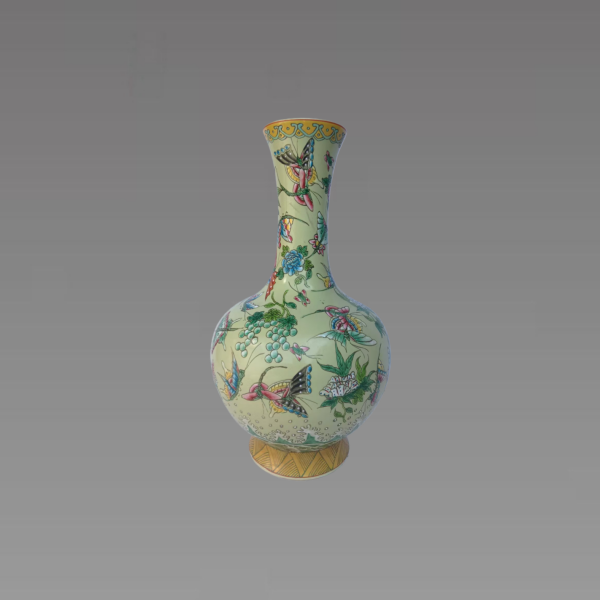 此藏品器底有“大清康熙年制”六字三行楷书款,器型承玉壶春瓶之雅韵,小口束颈、腹体丰圆,尽显清代早期瓶器的舒展气度;色彩以珐琅彩为地,绘有蝴蝶、葡萄、花卉等纹饰,红翠交错、彩料明妍,契合康熙瓷绘明艳鲜活的审美风尚;工艺上集彩绘与浅浮雕于一体,纹饰布局繁而不乱,线条细腻间见官窑制器的精工;其艺术价值在于以 “蝶寓绵延、葡兆丰饶” 的传统吉纹入饰,既彰显了康熙时期瓷绘的灵动意趣,亦承载着清代宫廷与民间共赏的吉祥文化,是兼具时代工艺水准与文化寓意的经典瓷作。具有较高的收藏价值和文化艺术欣赏价值!