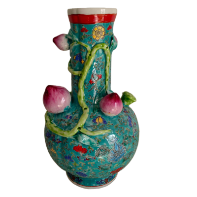 此藏品器底有“大清乾隆年制”六字两行篆书款。整体造型饱满规整,颈部修长、腹部圆润。色彩上以鲜亮匀净的绿松石蓝为地色,满施红、黄、蓝、紫等色交错铺陈的粉彩缠枝花卉纹样,设色饱满浓烈且层次分明,延续了清代粉彩 “艳丽不失雅致” 的色彩审美。工艺上以细腻流畅的粉彩绘就主体纹饰,同时以传统堆塑技法捏塑寿桃、枝蔓并粘于坯体,立体浮雕效果与彩绘、地色衔接自然,实现了“塑”与“绘”的技法融合。其寿桃元素寓意“长寿安康”、缠枝花卉象征“富贵连绵”,承载了传统吉祥文化的审美意趣,同时集堆塑、粉彩工艺于一体,既展现了传统制瓷技艺的精湛性,也反映了清代乾隆时期 “华丽繁缛” 的装饰风格,具有较高的收藏价值和文化艺术欣赏价值!