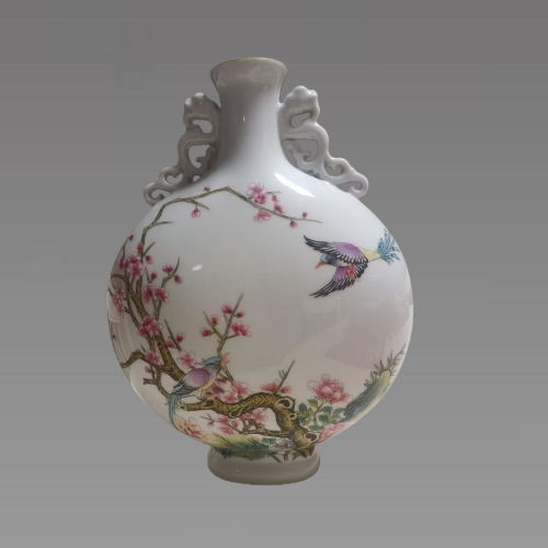此藏品器底有“雍正御制”四字两行青花楷书款,小口直颈、瓶身扁圆如满月,两侧装饰镂空如意云纹双耳。瓶身以粉彩绘就桃花与双鸟图景,虬曲枝干衬粉嫩花朵,灵鸟一栖一飞、羽色过渡细腻,鸟喙、爪部的细节刻画精准生动。通过 “花鸟相和” 的构图传递中式纹饰 “以形载意” 的吉祥内涵。它既承载了清代宫廷的审美取向与社会 “尚吉兆” 的文化氛围,又是清代粉彩瓷工艺巅峰期的实物例证,其“形、色、意”的融合既展现了中式瓷艺的美学追求,也成为研究清代宫廷瓷艺、社会文化的重要载体,具有较高的收藏价值和文化艺术欣赏价值!