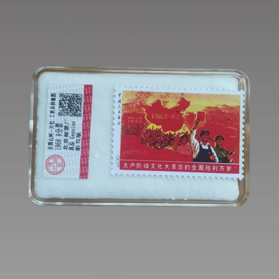 《全国山河一片红》票面图案为工农兵手持《毛主席语录》,背景中“革命委员会”的红旗汇成的红色海洋和工农兵群众热烈欢呼的场面,上方为一幅中华人民共和国地图,地图上除台湾省外全部绘成大红色,上面印有“全国山河一片红”金字。作为未正式发行的错版珍邮,它的设计、停发过程又成为反映当时艺术创作受政治干预、管理疏漏的文化物证,既承载了特殊时期的审美特征,也以 “稀缺性 + 历史关联性”,成为连接 “文革” 政治文化与当代收藏文化的特殊艺术载体。具有较高的收藏价值和文化艺术欣赏价值!