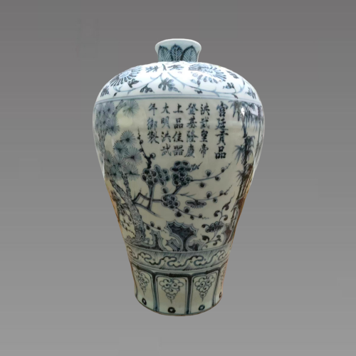 此藏品器型延续明洪武时期梅瓶典型样式,小口、短颈、丰肩、敛腹、胫部微撇,造型端庄厚重,既承继了梅瓶的实用功能,又展现出明初器物雄健饱满的美学特征。纹饰以 “岁寒三友”(松、竹、梅)为主体,搭配山石、灵芝等元素,辅以肩部缠枝花卉、底部如意云头纹,采用分层布局、勾勒渲染的技法,既蕴含松之坚韧、竹之有节、梅之高洁的文人精神内涵,也承载着吉祥寓意,同时还原了明洪武青花苍劲古朴的装饰风格。具有较高的收藏价值和文化艺术欣赏价值!