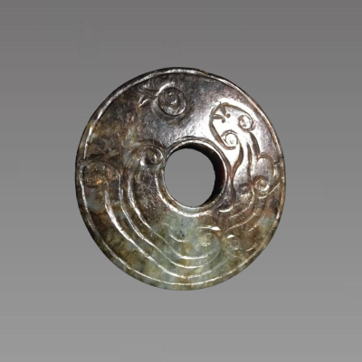 这件玉璧以灵动的凤鸟纹为核心纹饰,搭配婉转的卷云纹填充留白,线条流畅且造型舒展,既显灵动感又兼具规整的审美特质;工艺上采用宽细阴线结合的斜刻技法,一侧磨出斜坡形成立体层次,辅以两面钻孔与圆润打磨,呈现出工稳细腻的制作风格。它作为礼器类器物,纹饰中的意象既承载着祥瑞寓意与等级文化内涵,其线条、造型又体现出独特的艺术过渡性,既有着凝练传神的表现力,又暗含审美风格的承转特质,是当时工艺水平与礼制观念的实物印证。具有较高的收藏价值和文化艺术欣赏价值!