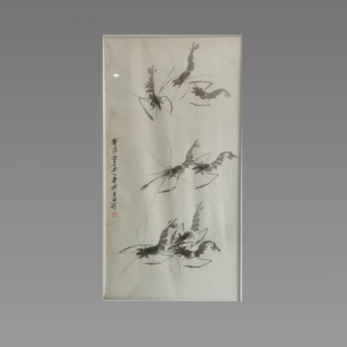 此藏品画面布局疏密有致,虾的分布错落自然,给人灵动之感,避免了呆板与局促。以留白营造出“水”的空间感,使虾仿佛游于无形之水中,体现了中国传统绘画 “留白” 的精妙,增添意境。画家运用墨色浓淡变化塑造虾的形态。浓墨绘虾眼、虾钳等关键部位,突出质感与立体感;淡墨表现虾身,层次丰富,生动展现出虾的透明质感与躯体弹性。线条流畅且富有变化,虾须、虾脚以细长线条勾勒,灵动飘逸,尽显虾在水中游动的姿态。具有较高的收藏价值和文化艺术欣赏价值!