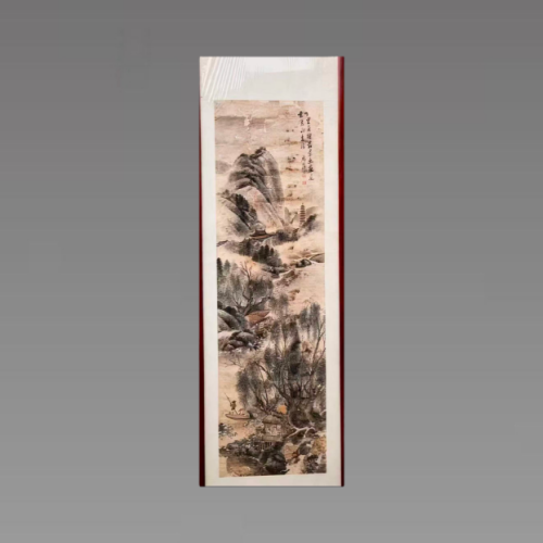此藏品以水墨为基底,仅佐以浅绛色调(淡赭、轻青等)晕染山石、点染林木,整体色彩素净雅致。浅淡的设色未喧宾夺主,既保留了水墨的空灵韵味,又通过柔和的色彩层次,让山水的悠远意境更显温润,契合传统文人画 “淡而不薄” 的审美追求。画面遵循传统山水画 “以景载情” 的特质,近景的村居、中景的林木、远景的山峦层层铺展,既体现了 “三远法” 的空间营造智慧,也通过疏密错落的布局,传递出 “可居可游” 的文人理想山水意境。以自然山水为媒介,寄托了对平和、悠远生活的向往,同时其笔墨、构图中的程式与意趣,也承载着中国传统美学中 “含蓄、空灵、天人合一” 的核心理念,是传统文化审美体系的具象体现。具有较高的收藏价值和文化艺术欣赏价值!