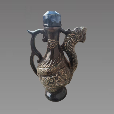 此藏品是传统陶瓷工艺与吉祥文化融合的实用装饰器物。其造型以经典壶式为基础,壶嘴采用龙首设计,壶身堆塑完整龙纹与祥云纹饰,龙形刻画细致、神态生动,既满足储用功能,又借龙、祥云等传统符号承载吉祥尊贵的文化寓意。工艺上采用窑变釉技法,釉色自然晕染、层次丰富,结合手工堆塑技艺,使纹饰立体饱满,尽显陶瓷工艺的质感与表现力。作为兼具实用价值与艺术属性的器物,它既体现了传统工艺的传承,也以鲜明的文化符号展现了中式美学的特质。具有较高的收藏价值和文化艺术欣赏价值!