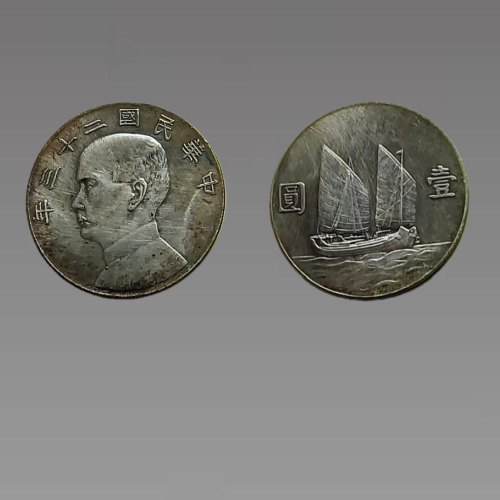 “船洋”银元为民国时期南京政府发行的银本位币。其正面图案铸革命先驱孙中山先生身着汉装的侧面头像,上方纪“中华民国×年”;背面图案是双桅帆船放洋图,纪值“壹圆”两字列在船的左右,直齿边。“船洋”发行后,在市场上深受民众欢迎,并和“袁大头”、“开国纪念币”一起逐渐取代了流通于市面的各式“龙洋”和外国银元。直至1935年国民党政府实行法币政策,禁止银元流通为止。
