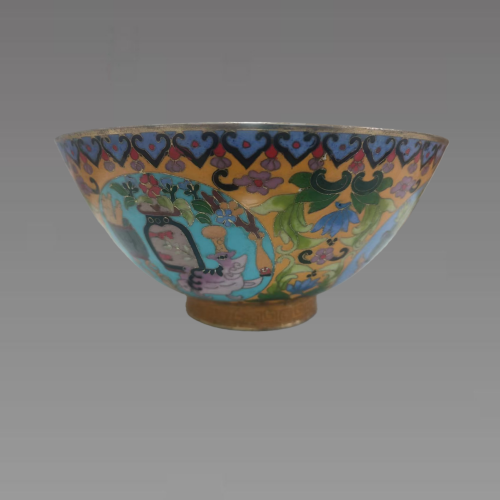 此藏品器底有“乾隆年制”四字两行篆书款,器型规整端庄,撇口弧壁,圈足稳健,线条流畅圆润,彰显典雅庄重的审美格调。碗身纹饰层次丰富,口沿以蓝地如意云头与卷草纹作边饰,构图严谨,起到界定空间、稳定画面的作用;腹部主体以黄色为地,填饰缠枝花卉与开光人物纹样,枝蔓连绵,花叶舒展,人物形象生动,衣纹流畅,色彩以黄、蓝、绿、红等珐琅釉料相互映衬,浓丽而不失和谐,充分展现出珐琅彩工艺色彩鲜亮、对比强烈的艺术特征。作为中国传统金属工艺与珐琅技术高度结合的典范,该器凝聚了制胎、掐丝、点蓝、烧蓝、磨光、镀金等多道复杂工序,体现了工匠精湛的技艺水平。其纹饰题材蕴含吉祥寓意与人文内涵,既保留了民间艺术的质朴生动,又融入了宫廷工艺的精致规整,是中西文化交流与本土工艺创新的重要实物见证,具有较高的收藏价值和文化艺术欣赏价值!