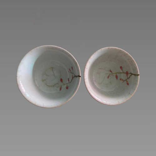 此藏品器底有“雍正年制”四字两行楷书款,器型为敞口弧腹矮圈足制式,线条圆润流畅,兼具实用功能与审美价值,是明清以来经典的日用瓷造型。其工艺采用高温白瓷胎为底,先施珊瑚红釉经低温烧成匀净浓艳的红地,再以粉彩技法在红地上绘饰花鸟纹样,通过玻璃白打底与洗染技法,使画面层次丰富、立体感强,集中体现了清代低温色釉与粉彩彩绘的高超技艺。碗身纹饰以 “喜上眉梢”“玉堂富贵” 为主题,蓝羽小鸟栖息于梅花、玉兰枝头,构图疏朗有致,色彩对比鲜明,既承载着传统吉祥文化的美好寓意,又彰显了清代宫廷与民间共赏的审美风尚。具有较高的收藏价值和文化艺术欣赏价值!