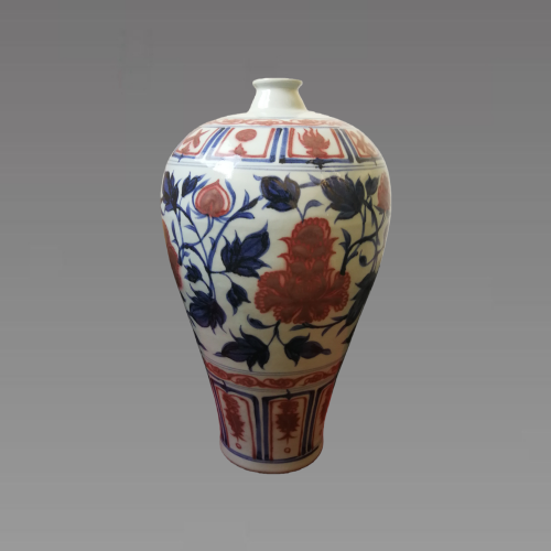 釉里红,瓷器釉下彩装饰手法之一,是将含有金属铜元素为呈色剂的彩料按所需图案纹样绘在瓷器胎坯的表面,再罩以一层无色透明釉,然后入窑在1300℃左右的高温还原焰气氛中一次烧成。创烧于元代景德镇,但数量极少,可谓凤毛麟角。原因是铜离子对温度极为敏感,在窑炉中火候不到,呈现黑红色或灰红色;火候销过铜离子便挥发,从釉层中逸出,呈现特有的飞红现象或干脆褪色,纹饰不连贯。当时烧柴窑很难控制窑温,只有凭把桩师父的经验与取出火照对比,无法大规模生产。