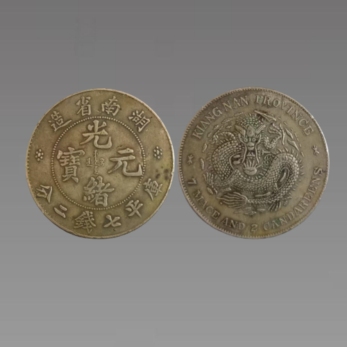 银币光绪元宝1898年--1907发行,正常成色为89%-90%。正面铸有铭文,顶部铸楷体“XX省造”或“造币总厂”,底部铸货币价值如:“库平一钱四分四厘”,中心直读“光绪元宝”四字,币中心为满文“光绪元宝”。银币背面外圈顶部用小号英文标准字体铭“XX省造”或“造币总厂”字样,下面为英文货币价值,内圈铸有中心为蟠龙图,品相精致,其审美风格独特。钱币虽小,也可管窥社会文化一斑。