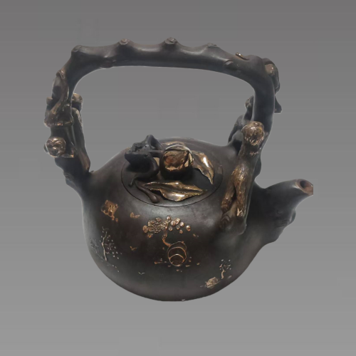这是一把陈鸣远款的紫砂提梁壶,以仿生树桩为造型核心,提梁、壶嘴皆取老枝形态,苍劲古朴,壶盖与壶身的描金花卉、寿桃装饰更添雅致。它继承了陈鸣远 “自然入壶” 的创作理念,将器型与自然意趣融为一体,既保留了紫砂器的实用功能,又以精湛的贴塑、描金工艺赋予其文人雅玩的艺术价值,是清代紫砂花器风格的典型体现。具有较高的收藏价值和文化艺术欣赏价值!