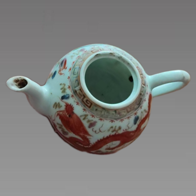 此件粉彩龙凤纹茶壶胎质细腻坚致,釉面莹润光洁,器型规整圆润,流、柄比例协调,形制端庄实用。器身以粉彩精工绘饰龙凤纹样,龙纹矫健威猛,凤纹婉转灵动,龙凤呈祥,寓意吉祥富贵、祥瑞和合,纹饰线条流畅,设色明艳雅致,层次分明,兼具传统粉彩瓷的彩绘工艺与民俗吉祥文化内涵,整体气韵典雅,是兼具陈设观赏性与实用价值的传统粉彩瓷佳作,承载着中式吉祥文化与陶瓷彩绘工艺的经典风貌。具有较高的收藏价值和文化艺术欣赏价值!