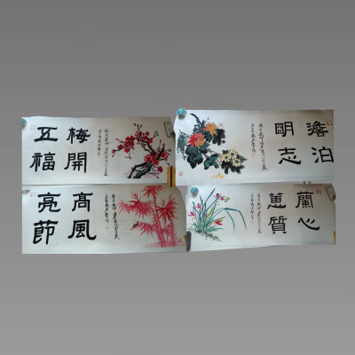 这幅梅兰竹菊四屏幅,笔墨功底扎实,写意技法娴熟老辣,线条劲挺流畅,设色温润雅致,晕染自然通透,以兼工带写的笔法精准勾勒出梅、兰、竹、菊的形态风骨,枝、叶、花、蕊层次分明、疏密得当,形神兼备气韵生动。作品将写意花鸟与楷书楹联相得益彰,配以梅开五福、高风亮节、淡泊明志、兰心蕙质等题句,书画同辉、文墨相融,既尽显传统文人画的笔墨意趣与扎实画技,又寄寓高洁品格与吉祥福瑞,意境清雅悠远,是兼具艺术水准与文化内涵的四君子佳作。具有较高的收藏价值和文化艺术欣赏价值!