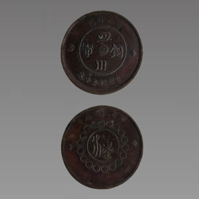 这枚铜元的面值为当制钱二十文,在四川军政府铜币的系列面值中属于主流中等规格,同期并行的还有十文、五十文、一百文等面值,二十文的发行量与存世量介于小面值十文与大面值五十文、一百文之间,流通使用频率高,版式也相对稳定,是该系列中最具代表性的品类之一。材质方面,军政府造四川铜币当制钱二十文以红铜也就是紫铜为主要铸币材料,黄铜质地多为试样性质,存世极少,市面流通所见均为标准红铜材质,钱币直径约三十一至三十二毫米,厚度约一点八毫米,标准重量在九点五克至十点五克之间,经过百年流通磨损后,实物重量会略有下降,整体采用民国初年标准机制冲压工艺铸造,形制规整,工艺特征贴合当时地方造币厂的生产水平。
