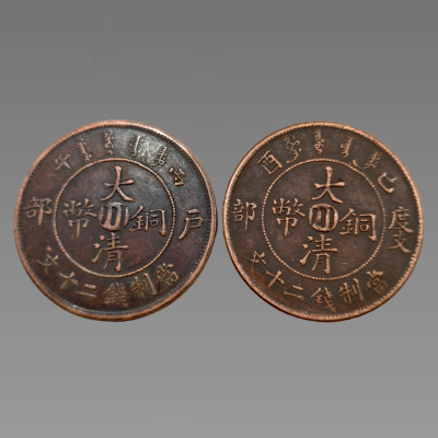 这两枚大清铜币隶属于清代末年全国统一规制的机制铜元体系,清光绪二十六年起,各省开始仿造西式机制铜元,取代传统方孔制钱,为统一币制、规范市场流通,光绪三十一年,清政府户部颁布新币制,下令停铸旧式光绪元宝铜元,改铸大清铜币,由户部统筹规制,各省依照中央标准开铸,币面统一标注 “大清铜币” 国号字样,同时以干支纪年区分铸造年份,中心镌刻各省简称作为铸造地标识,四川省作为清末铜元铸造大省,开设四川铜元局,依照户部章程开铸中心 “川” 字大清铜币,流通于四川及西南地区,是当地主要的小额流通硬通货。其中丙午纪年版铸造于光绪三十二年,为光绪朝晚期主流铸品,己酉纪年版铸造于宣统元年,此时清廷币制再度调整,铜元铸造规格与文字细节略有改动,两枚钱币分属光绪、宣统两朝,完整反映了清末最后数年中央铜元铸行制度的延续与变化。