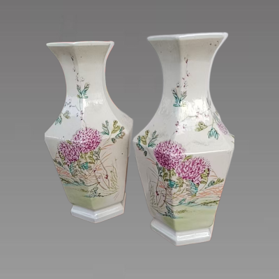 这对六方瓶,以温润的白瓷为胎,器形挺拔规整,线条流畅而富有张力。瓶身通体采用浅绛彩工艺,以细腻笔触绘就花卉景致:主花为饱满艳丽的粉紫色团花,旁衬翠绿枝叶与淡彩山石,色彩清雅和谐,层次分明。瓶肩与颈部点缀着纤细的枝蔓与小花,与主体纹饰呼应,整体构图疏密得当,兼具文人画的写意意趣与传统瓷绘的精工之美。器物釉面莹润,胎质细腻,既体现了晚清民国浅绛彩瓷的典型风格,也承载着中式美学中 “以器载道” 的审美追求,是兼具观赏性与文化内涵的陈设佳器。具有较高的收藏价值和文化艺术欣赏价值!
