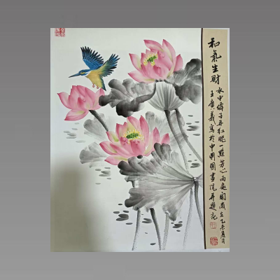 王广义的艺术创作根植于中国传统花鸟画文脉,以大写意荷花为核心标识,形成了笔墨酣畅、形神兼备、气韵生动的鲜明艺术面貌。他深谙大写意 “以意写神” 的精髓,以书入画,将书法笔力融入运笔,线条苍劲老辣、奔放传神,尤擅没骨技法,以泼墨、积墨之法绘荷叶,墨色淋漓而层次分明,荷茎则以中锋运笔尽显清拔风骨;色彩运用上实现传统与现代的精妙平衡,着色幽艳不滞腻、淡雅不轻薄,以粉润晕染荷花、浓艳设色禽鸟,与水墨形成鲜明对比,动静相生;造型与构图上遵循 “源于生活而高于生活” 的理念,在写生基础上提炼物象精神气韵,做到形神兼备,构图开合有度、疏密有致,以留白营造悠远意境;同时他在继承传统的基础上大胆创新,融合西画造型精准与中国画笔墨意趣,让笔下荷花超越物象本身,成为承载文人精神与生命意趣的文化符号,尽显格调高华、丰韵独特的艺术境界,这幅《和气生财》便是其艺术风格的典型体现。