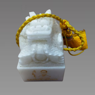 此件和田玉玉玺承袭中国古代玺印的经典规制,整体造型庄重规整,尽显威仪气度。印身呈方正形制,契合 “天圆地方” 的传统宇宙观与 “规矩方正” 的处世哲学,是中华礼制文化在器物形制上的直观体现;印台之上雕琢瑞兽印纽,造型雄浑饱满,线条流畅凝练,将玉石的温润质感与瑞兽的威严气势融为一体。玉玺周身以明黄色丝绦束系,搭配传统流苏装饰,既延续了古代玺印 “佩绶” 的礼制传统,更以明黄之色彰显尊贵气韵,整体形制比例协调、工艺精湛,集实用功能、礼仪象征与艺术审美于一体,是传统玉印形制的当代传承与演绎。