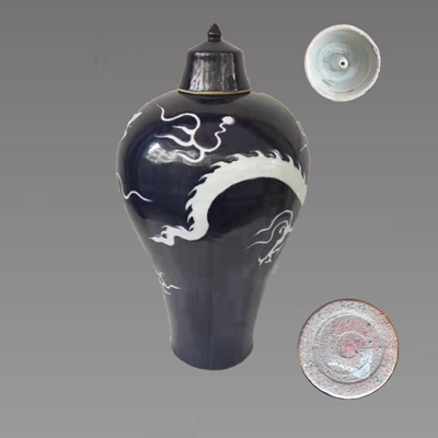 此梅瓶尺寸:通高(带盖)48.5厘米,高42.5厘米,口径5厘米,底径13.4厘米。器型高大,肩、颈、口的比例近乎完美,宛如美人垂肩玉立。纯粹的钴蓝釉明亮而深邃,如湛蓝浩翰的宇宙,竹刀剔刻的骄龙鳞甲如铁,趾爪有力,御风而行,卷云戏珠,威猛矫健。具有极高的收藏价值。