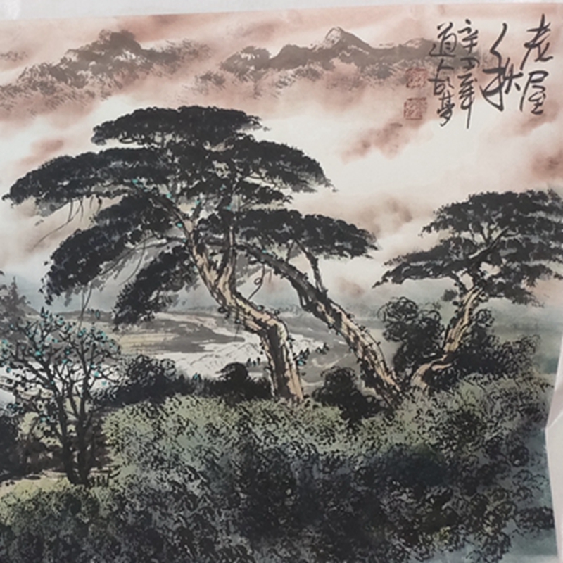 此幅作品为道境彩墨山水画《老屋秋》,画中苍松古柏,巨石磷天,白鹤翔宇,玉树琼花,古木幽林,香溪久挽,红日旭阳,完美的表达了山水画的尽善尽美,更符合于博学范畴中的诗书画意,既见传统绘画底蕴,又参入画家惯用的成熟笔墨技法,功力精深,气韵盎然,超凡脱俗,他的山水画作品大气恢宏,磅礴秀美,沉郁雄深,古风古韵,给人带来了一股强烈的视觉冲击力。胡梦老师在大自然中陶冶、追求、领悟,取之自然,妙造自然,达到物我两化之境界,把大自然的山川精髓和灵气,融进他的写意山水画中,再经过画家内心的感悟加工提炼出来。淋漓尽致的表达了画家道境写意山水华风格。